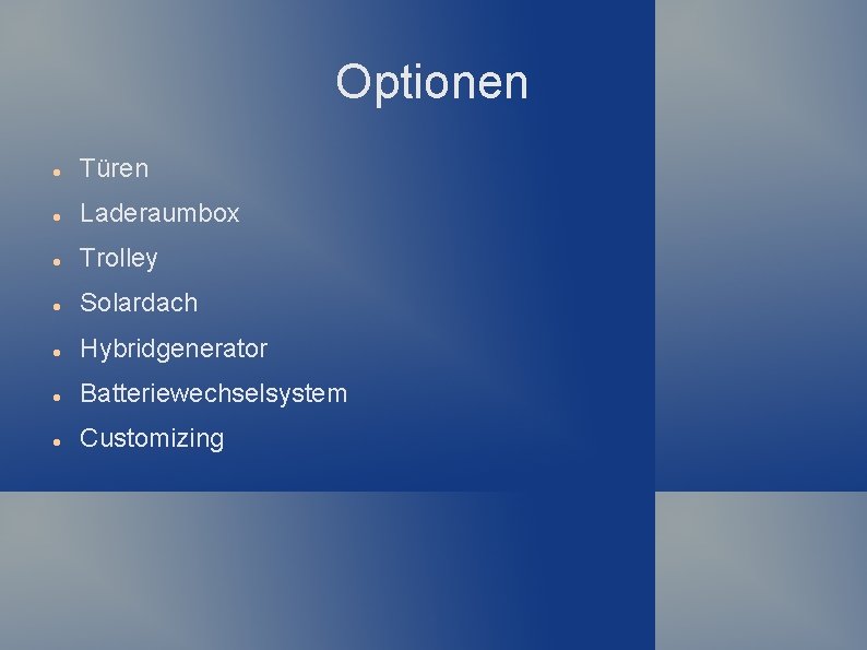 Optionen Türen Laderaumbox Trolley Solardach Hybridgenerator Batteriewechselsystem Customizing