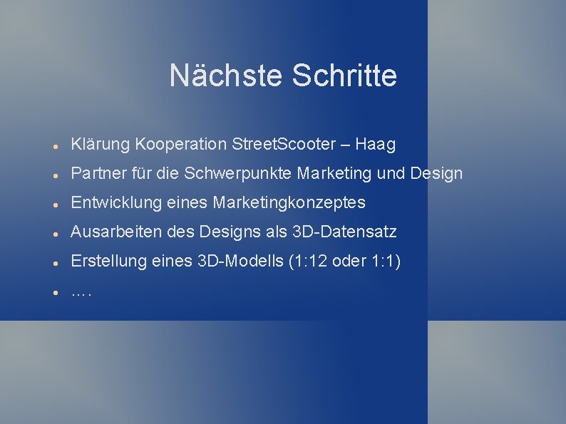 Nächste Schritte Klärung Kooperation Street. Scooter – Haag Partner für die Schwerpunkte Marketing und Design Entwicklung eines Marketingkonzeptes Ausarbeiten des Designs als 3 D-Datensatz Erstellung eines 3 D-Modells (1: 12 oder 1: 1) ….
