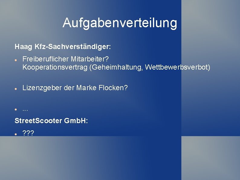 Aufgabenverteilung Haag Kfz-Sachverständiger: Freiberuflicher Mitarbeiter? Kooperationsvertrag (Geheimhaltung, Wettbewerbsverbot) Lizenzgeber der Marke Flocken? . . . Street. Scooter Gmb. H: ? ? ?