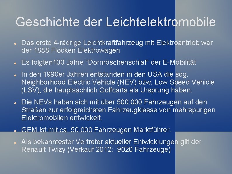 Geschichte der Leichtelektromobile Das erste 4 -rädrige Leichtkraftfahrzeug mit Elektroantrieb war der 1888 Flocken Elektrowagen Es folgten 100 Jahre “Dornröschenschlaf“ der E-Mobilität In den 1990 er Jahren entstanden in den USA die sog. Neighborhood Electric Vehicle (NEV) bzw. Low Speed Vehicle (LSV), die hauptsächlich Golfcarts als Ursprung haben. Die NEVs haben sich mit über 500. 000 Fahrzeugen auf den Straßen zur erfolgreichsten Fahrzeugklasse von mehrspurigen Elektromobilen entwickelt. GEM ist mit ca. 50. 000 Fahrzeugen Marktführer. Als bekanntester Vertreter aktueller Entwicklungen gilt der Renault Twizy (Verkauf 2012: 9020 Fahrzeuge)