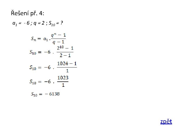 Řešení př. 3: a 4 = 3 ; a 7 = - 81 ; a 1 = ? ; q = ? ar = as. q r-s a 7 = a 4. q 7 -4 - 81 = 3. q 3 / : 3 - 27 = q 3 / -3=q q=-3 an = a 1. q n-1 a 7 = a 1. q 7 -1 - 81 = a 1. (-3) 4 - 81 = a 1. 81 /: 81 - 1 = a 1 zpět