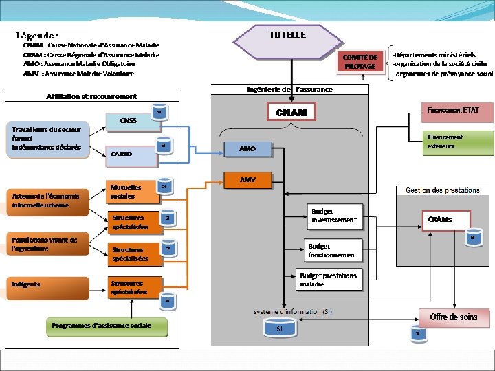 Description du schéma d’assurance maladie Un système conçu en vue de permettre une couverture de base pour tous à l’horizon 2015; Un système qui combine l’AMO et l’AMV; Un système fondé sur la promotion d’un paquet de prestations de base applicable à toute la population; Un schéma bâti autour d’un organe central qui s’appui sur des structures spécialisées auxquelles il délègue certaines fonctions.