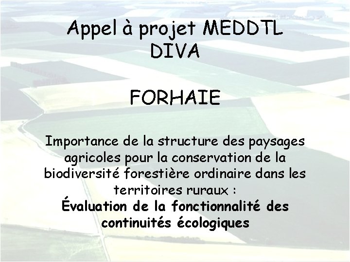 Appel à projet MEDDTL DIVA FORHAIE Importance de la structure des paysages agricoles pour la conservation de la biodiversité forestière ordinaire dans les territoires ruraux : Évaluation de la fonctionnalité des continuités écologiques