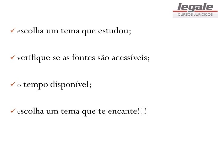 Como começar? ü Por qual ASSUNTO mais me interesso? ü O que eu já sei sobre o assunto? ü É preciso ler, ler. . . NÃO DESISTA!!! ü Não se esqueça da questão metodológica.