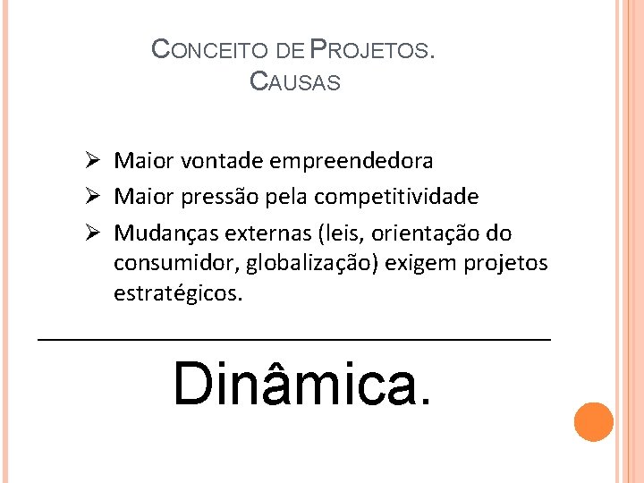 CONCEITO DE PROJETOS. CAUSAS Ø Maior vontade empreendedora Ø Maior pressão pela competitividade Ø Mudanças externas (leis, orientação do consumidor, globalização) exigem projetos estratégicos. ______________________ Dinâmica.