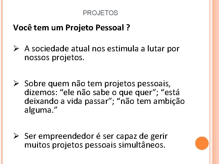 PROJETOS Você tem um Projeto Pessoal ? Ø A sociedade atual nos estimula a lutar por nossos projetos. Ø Sobre quem não tem projetos pessoais, dizemos: “ele não sabe o quer”; “está deixando a vida passar”; “não tem ambição alguma. ” Ø Ser empreendedor é ser capaz de gerir muitos projetos pessoais simultâneos.