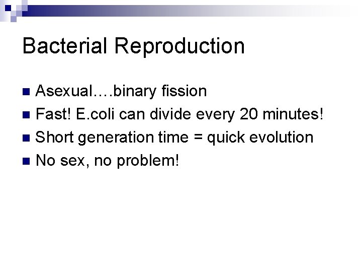 Bacterial Reproduction Asexual…. binary fission n Fast! E. coli can divide every 20 minutes! n Short generation time = quick evolution n No sex, no problem! n
