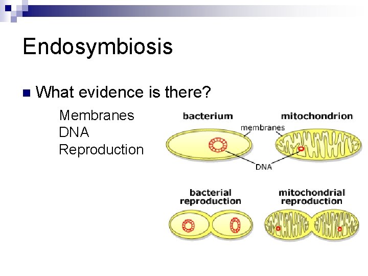 Endosymbiosis n What evidence is there? Membranes DNA Reproduction