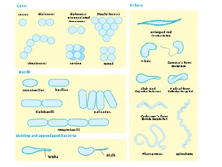 • Bacillus: rod shape eg. Bacillus spp. – Coccobacilli – The shape of the rod’s end often varies – Some bacteria form long multinucleate filaments – eg. Actinomycetes • Sprillum: long rods twisted into spirals or helix – spirilla (rigid) spirochetes (if flexible) • Size: – Mycoplasma are only 100 200 nm in diameter – E. coli is 1. 1 to 1. 5 µm wide by 2. 0 to 6. 0 µm. long, – Spirochetes size reaches 500 µm in length