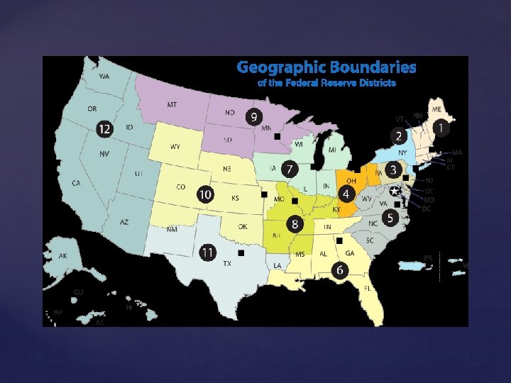 Twelve District Banks Carry out the policy established by the Board of Governors Meets the needs of their particular regions Structure of Fed: District Banks