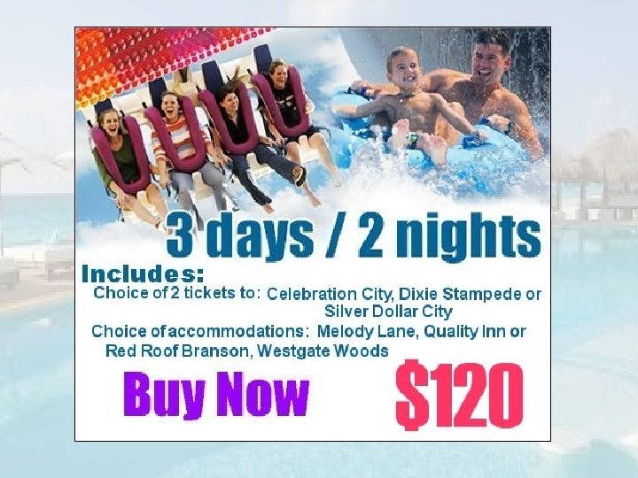 Advertising • Offer something free (aka bribery) ex. Towel, water bottle, shuttle to/from hotel or attractions, champagne, wi-fi, satellite TV, 3 rd night free, excursion, room upgrades • Drop your price or create special packages or bundles Examples of promotions: • http: //www. nottawasagaresort. com/packagespromotions. html
