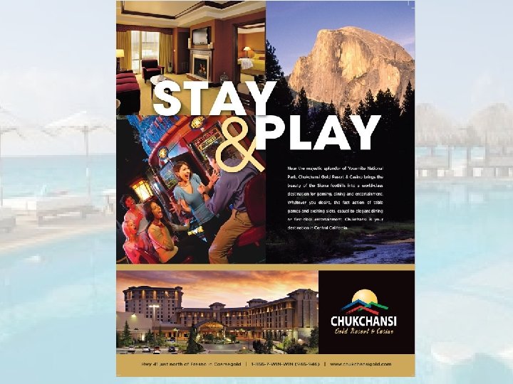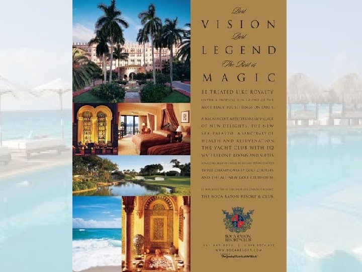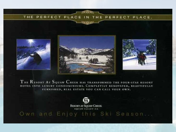 Assignment: Promoting your own resort Consider: What type of resort would you have? • Beach, ski, golf, “dude ranch” What would you offer your guests to draw them in? What services do you have? Will you offer any packages or use bribery? Think back to the Advertising Techniques handout