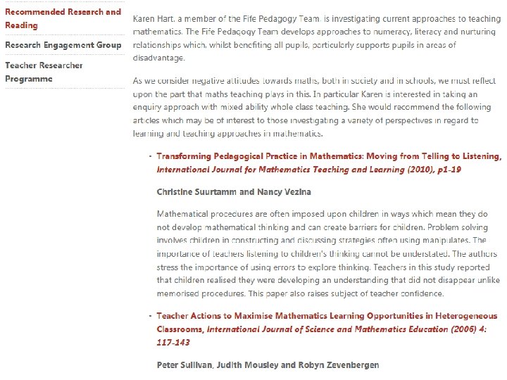 Teachers as researchers Teachers should be: “Increasingly expert practitioners whose professional practice and relationships are rooted in strong values, who take responsibility for their own development and who are developing their capacity both to use and contribute to the collective understanding of the teaching and learning process. ” “Teaching Scotland’s Future” 2011