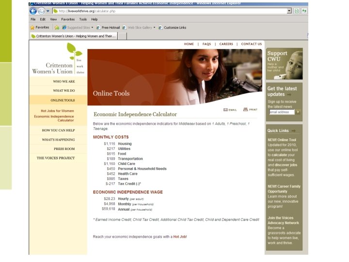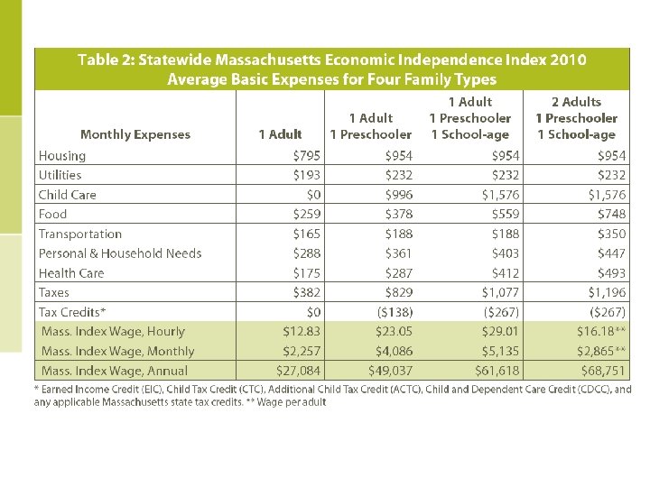 Women in a Down Economy • In 2006, 72% of all Massachusetts households living below the federal poverty line were headed by single mothers. • 49% of women work in low-paid occupational sectors; retail, service and administration • In 2008 women’s wages in these occupations ranged from $21, 000 - $30, 000, well below the Mass. Index requirements for most families • In 2006 women in MA earned 72% as much as men performing the same jobs.