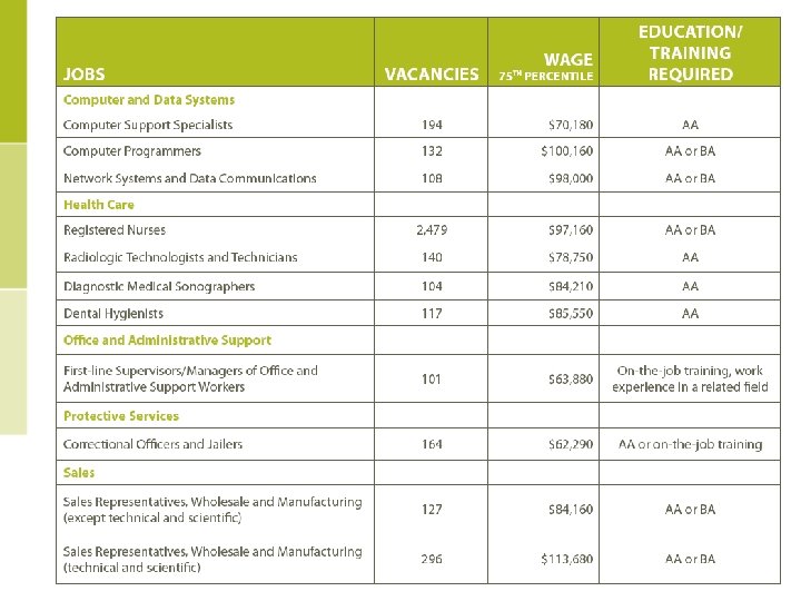 What is a Hot Job? • High Demand defined as 100 or more openings statewide • Requires two years or less of post-secondary education • Pays a family sustaining wage, defined as the Mass. Index Massachusetts average for a single parent with one preschool and one school-age child