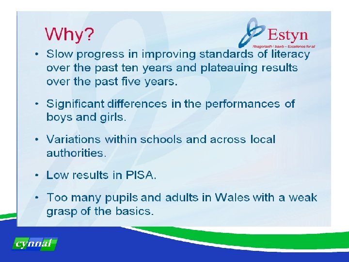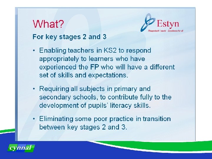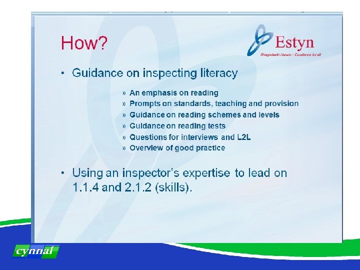 Focus on developing literacy in Wales Ø Subject orders 2008 Ø Skills Framework – communication ØCommon Inspection Framework – Estyn 2010 (1. 1. 4 and 2. 1. 2) ØSchool Effectiveness Framework ØBasic Skills Wales: Communication, Numeracy, ICT ØEssential Skills Wales (ESW): Communication, ICT, Application of Number ØDCELLS / Welsh Assembly Government ØWelsh Medium Education Strategy ØLanguage, Communication and Literacy Strategy (Cynnal) ØLanguage for Thinking and Learning (Cynnal) ØWelsh Education Plan