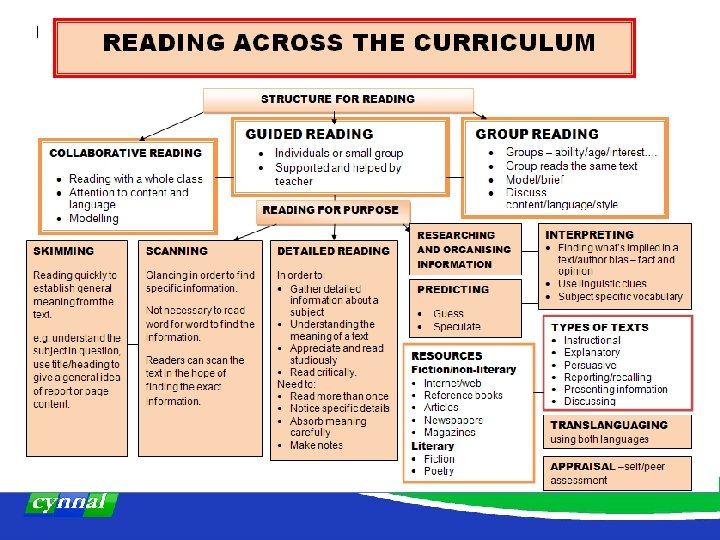 What are all teachers expected to do in their subjects? • Provide frequent opportunities to develop reading according to the subject requirements • Contribute to a ‘reading school’ climate: reading as a stimulus, wall displays, relevant and suitable materials, subject vocabulary… • Plan carefully for reading: purpose; appropriate reading materials for learners’ reading skills; appropriate reading strategies (see further guidance) • Help learners to acquire a range of strategies for gathering information including multimedia texts • Identify opportunities for joint reading e. g. pair, group reading, when doing various activities.