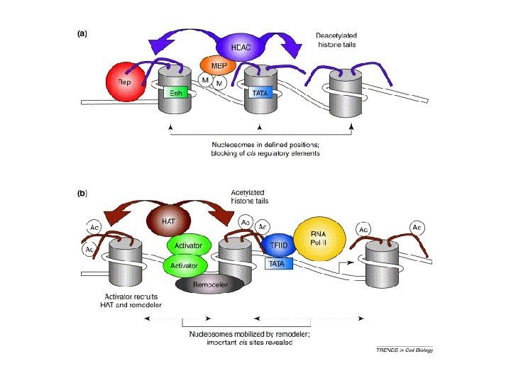 Acetilazione degli Istoni • E’ una modificazione post-traduzionale • Gruppi acetilici (CH 3 COO–) legati covalentemente a aminoacidi basici Neutralizzano le cariche positive • Eliminano le interazioniche con il DNA • Diminuiscono la condensazione • Associati con una attiva trascrizione
