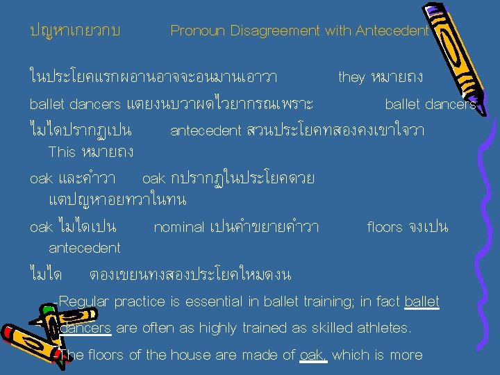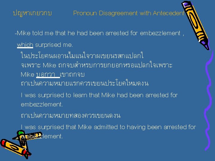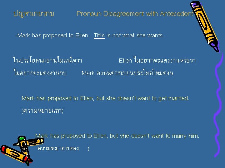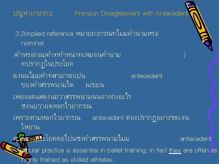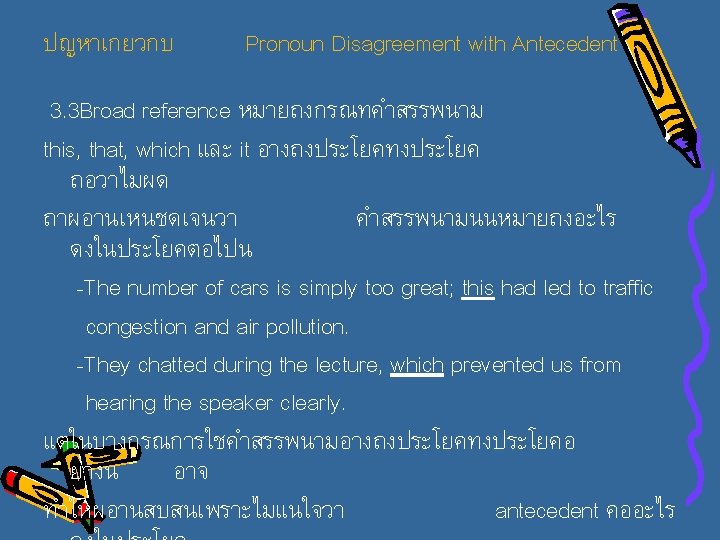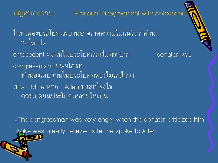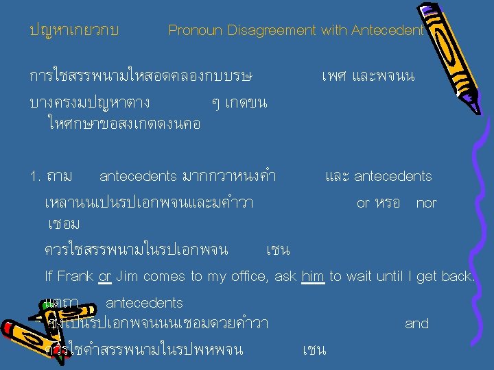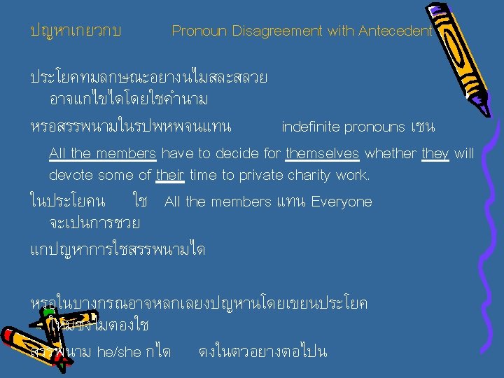 ปญหาเกยวกบ Pronoun Disagreement with Antecedent ประโยคเดม No one will be considered for the position until he or she has passed a written examination. ประโยคใหม No one who has not passed a written examination will be considered for the position.