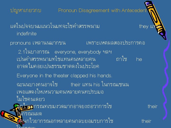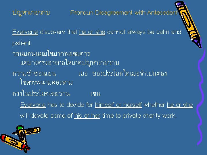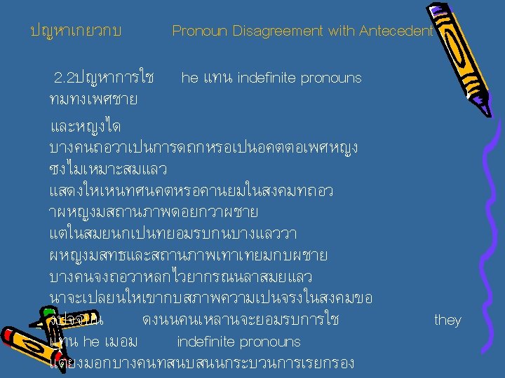 ปญหาเกยวกบ Pronoun Disagreement with Antecedent . 2ตามหลกไวยากรณทใชมานานแลวถอวา indefinite pronouns เชน everyone, everybody, no one, nobody, each, either, neither, anyone, anybody, someone และ somebody เปนคำสรรพนามบรษทสาม ฉะนนถาจะใชจงควรใชรปเอกพจนเพศชาย ดงในประโยคตอไปน Everyone in the office expressed his opinion. If someone calls, tell him I’ll call him back. Has either of the students submitted his report yet?