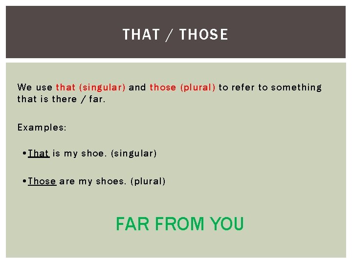 THAT / THOSE We use that (singular) and those (plural) to refer to something that is there / far. Examples: • That is my shoe. (singular) • Those are my shoes. (plural) FAR FROM YOU