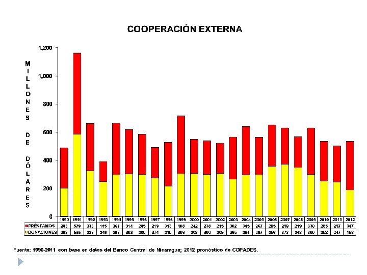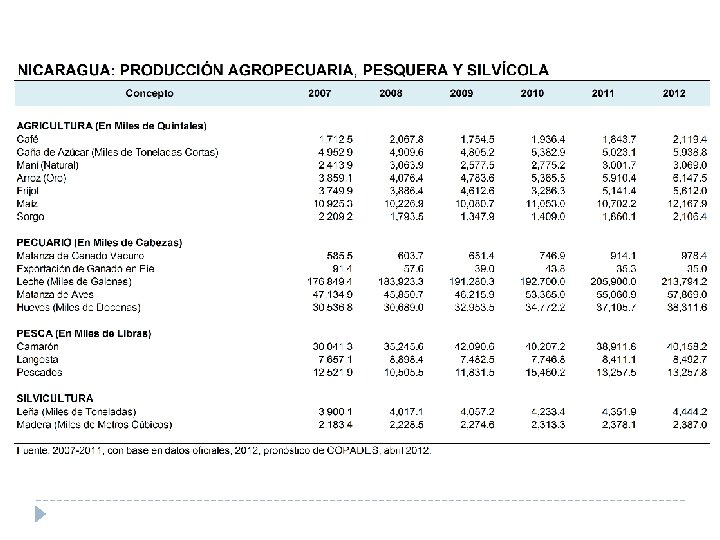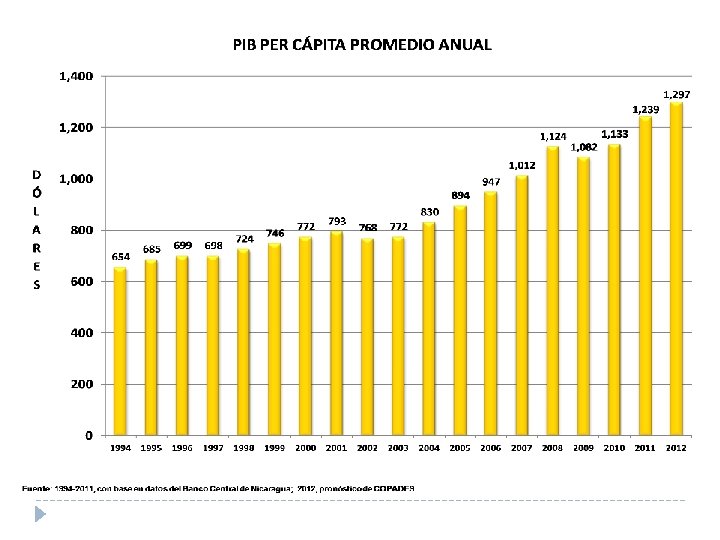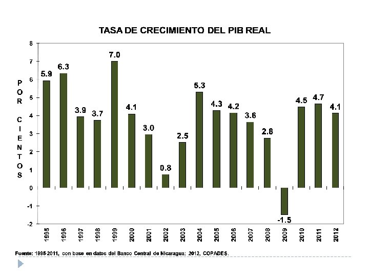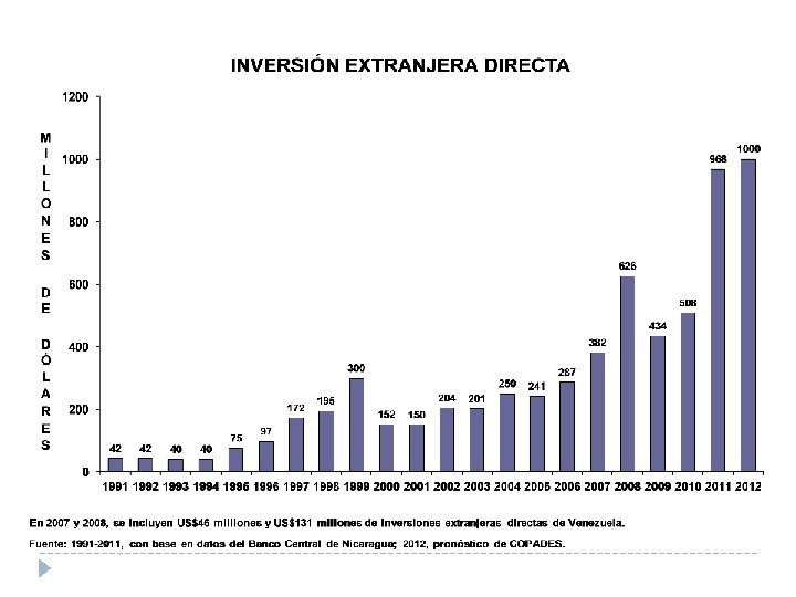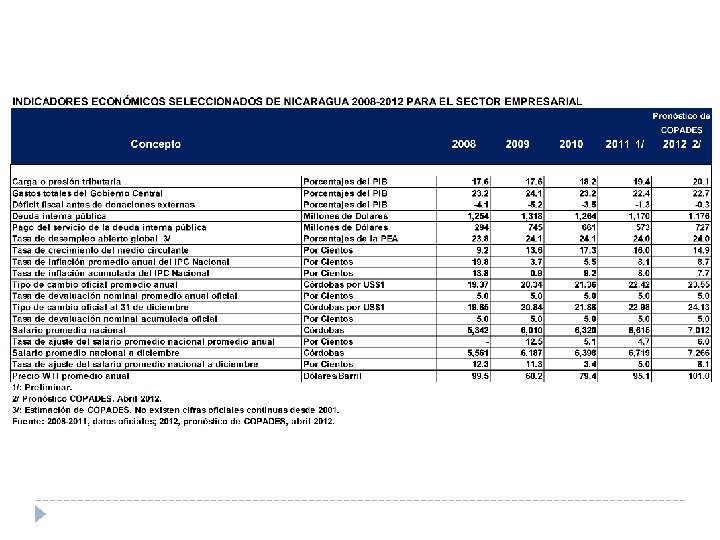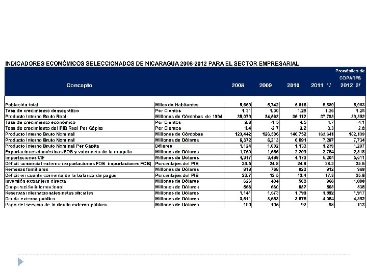 LA ECONOMÍA DE NICARAGUA EN 2012 (2) � Un déficit comercial externo de US$2, 747 millones (36% del PIB) y un déficit de la cuenta corriente de la balanza de pagos de igual a US$1, 994 millones (26% del PIB). � Para financiar el déficit comercial externo, se prevé la desaceleración del flujo de remesas familiares que totaliza US$969 millones, un ingreso de inversiones extranjeras directas aproximado a US$1, 000 millones, un monto de cooperación externa oficial de US$535 millones y una asistencia financiera de Venezuela de US$660 millones. � Las reservas internacionales brutas muestran un aumento de US$25 millones hasta US$1, 917 millones y equivalen a 2. 18 veces el saldo de la base monetaria a finales del año. � Sin los efectos de la próxima reforma tributaria, la presión tributaria es de 20. 1% del PIB, es decir US$1, 552 millones, y el déficit fiscal de US$21 millones es igual 0. 3% del PIB antes de incorporar la cooperación internacional en el presupuesto que ya está en equilibrio con un índice de pobreza cercano a 40% y con un desempleo global de 24. 0% de la población económicamente activa.