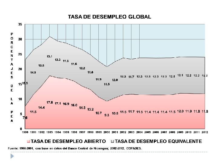 LA ECONOMÍA DE NICARAGUA EN 2012 (1) � La disminución de los volúmenes y precios de las exportaciones a Estados Unidos y la Unión Europa, que participan con el 41% en el valor total de las exportaciones de bienes FOB del país. � La tasa de crecimiento económico es de 4. 1% y podría desacelerarse 1 punto porcentual, dependiendo de cuán profunda sea la recesión económica europea. � La alta tasa de desempleo global (abierto y equivalente asociado con el subempleo) de 24. 0% de la población económicamente activa; es decir que en este año 773 mil personas no generarán ingresos. Además, 1 millón 960 mil personas tendrán problemas de empleo. � Una menor tasa de inflación, que se acelera 7 décimas porcentuales hasta 7. 7% debido a la alza de 9% de la tarifa de energía eléctrica a partir del consumo facturado de enero de 2012, otra alza de US$5 hasta US$100 del precio promedio anual de un barril de petróleo WTI y un aumento acumulado anual (de diciembre 2011 a diciembre 2012) de 15% del saldo de medio