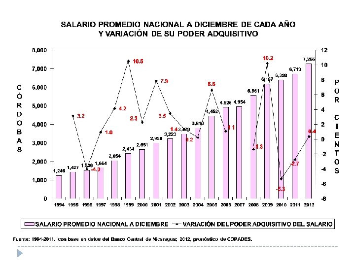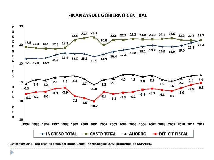 PERFIL DE LA POLÍTICA FISCAL 2012 � � Un gasto total igual a 22. 3% del PIB, equivalente a US$1, 782 millones, que se carateriza principalmente por las siguientes políticas: � Un ajuste salarial de 7%, excepto el personal de salud y educación que será de 9%; � Un aumento de 6% para la compra de bienes y servicios de consumo; � Otro ajuste de 10% en los gastos de energía eléctrica y combustibles; � El mantenimiento de los subsidios de agua, energía eléctrica y teléfono a jubilados, de energía eléctrica en barrios vulnerables y de transporte colectivo urbano de Ciudad de Managua y Ciudad Sandino; � La garantía de la gratuidad y mejorar los servicios de salud y educación; y � La reducción de la pobreza a través de la inversión pública destinada principalmente a los sectores de energía, educación, salud, agua y saneamiento, infraestructura vial y construcción de viviendas de interés social. � La asignación de US$3. 8 millones para el Banco de la Alianza Bolivariana para las Américas (BALBA). � La emisión de Bonos de la República de Nicaragua por US$122 millones para pagar, a lo sumo, la mitad de las amortizaciones de los Certificados de Bonos de Pagos de Indemnización (BPI) y Bonos de la República de Nicaragua. De cada C$100 de producción, el gobierno captará C$20. 10 en concepto de impuestos, equivalentes a US$1, 552 millones en el año. El déficit fiscal antes del registro de la cooperación internacional es igual a 0. 3% del PIB y equivalente a