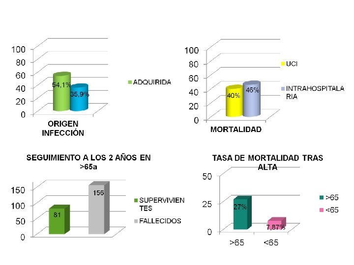 La incidencia de DM, EPOC e ICC fue significativamente mayor en >65. Inmunodepresión, cirrosis o abusos de etanol fue superior en <65. Sepsis abdominal fue mayor en >65 de manera significativa, sin encontrar diferencias significativas en los otros focos. Desarrollo de shock séptico fue mayor en >65 de manera significativa. Mortalidad fue mayor en grupo >65, elevándose de manera significativa a los dos años.