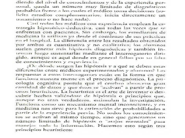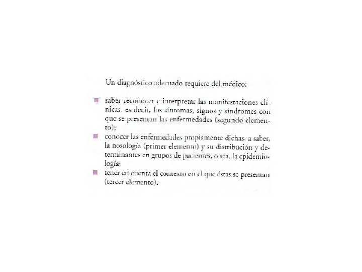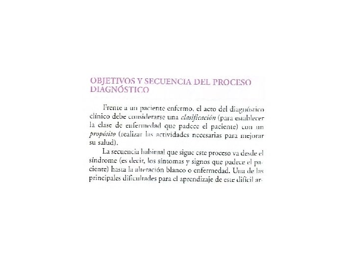 • Requisitos: 1) Conocer los elementos que son necesarios de reconocer frente al paciente enfermo. 2) Conocer los objetivos y secuencia habitual del proceso diagnóstico. 3) Conocer las diferentes estrategias utilizadas para realizarlo en distintos contextos.