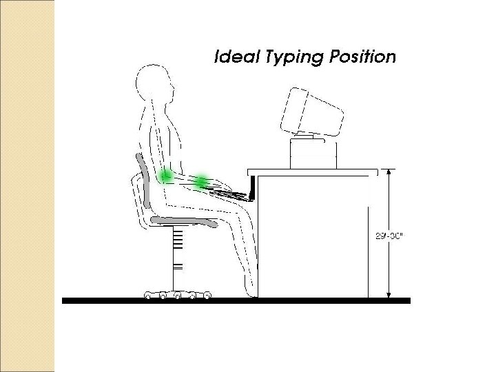 Quiet Wrists and Elbows • My wrists are level and relaxed. • My wrists are not resting on the keyboard or table. • My elbows are resting naturally at my side. • My shoulders are relaxed. • Forearms nearly parallel with slope of keyboard • Hands and wrists "quiet, " almost motionless