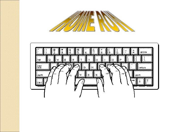 Fingers on HOME ROW • My fingers are resting lightly on the TIPS of Home Row keys. • My index fingers are resting on F and J. • With each key stroke my fingers quickly return to Home Row. Strive for this Not this. .