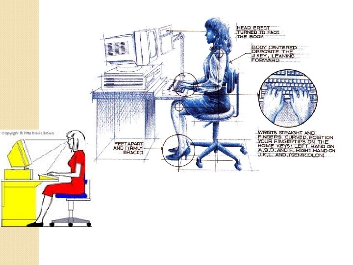 Posture Spine straight leaning slightly forward Centered in front of keyboard Comfortable distance from keyboard Feet on floor, slightly apart Eyes on the screen or the copy I am facing toward my computer