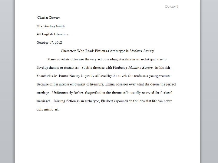 Parentheticals DO’s and DON’Ts: • DO put a PERIOD after the last parenthesis, NOT at the end of the quote: – Romantic poetry is characterized by the "spontaneous overflow of powerful feelings" (Wordsworth 263). • DO NOT include the author’s name if you already said it in the sentence: – Wordsworth stated that Romantic poetry was marked by a "spontaneous overflow of powerful feelings" (263).