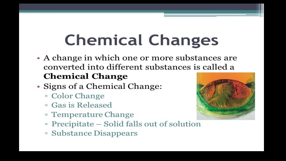 Chemical Changes • The composition of matter always changes during a chemical change. • A new substance is formed. • Words associated with chemical changes: • • • Burn Rot Rust Decompose Ferment Explode • Also called chemical reactions