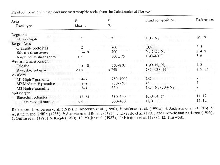 Eclogite - HP granulite metamorphism N 2 - CO 2 +/- H 2 O(eclogite facies) Granulite facies metamorphism CO 2 Amphibolite facies metamorphism and lower H 2 O, CO 2, +/- CH 4, +/- N 2 References relevant to Norway Andersen T, Touret J, Austrheim H, Elvevold S, Van den Kerkhof A, Larsen R