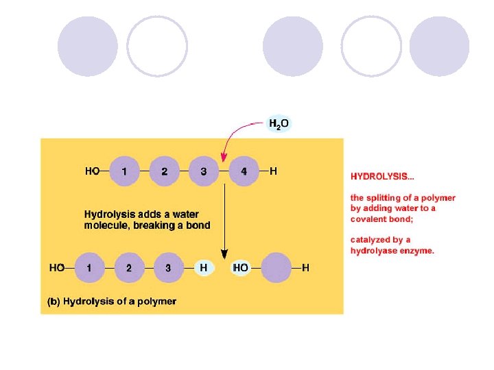 Hydrolysis l (aka Cleavage Reaction) l Reverse of a Condensation Reaction. l Breaks down larger molecules into smaller ones. l Molecules are split apart and an OH group is added to one molecule and a H atom is added to the other.