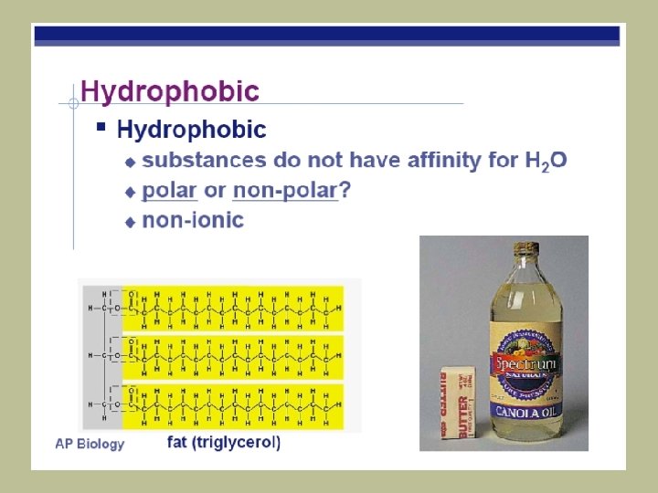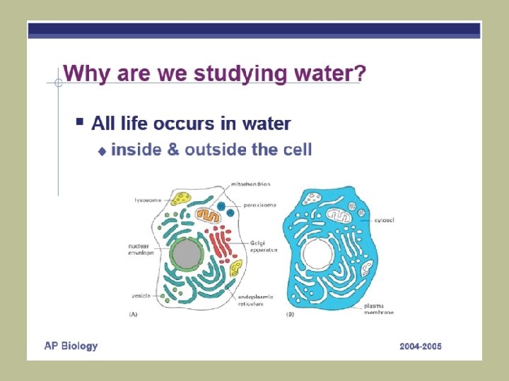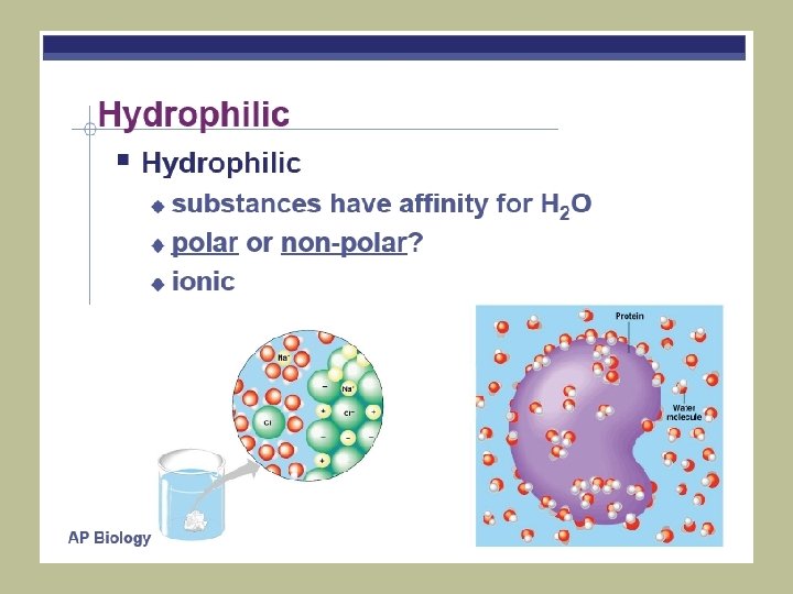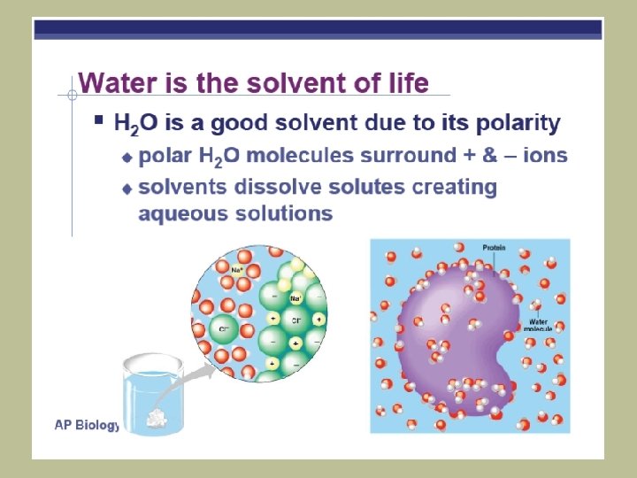 Properties of Water is polar …. Remember…. Water has 2 hydrogen atoms and one oxygen atom H 2 O _ (–) Hydrogen bond (+) H O H + (+) H O (–) H (–) (+) (–) + (+)