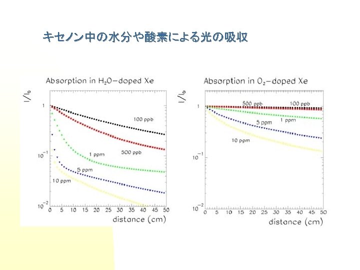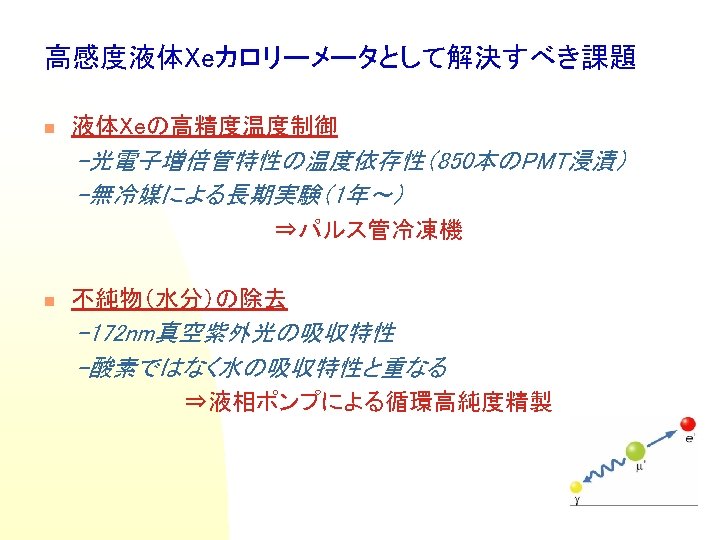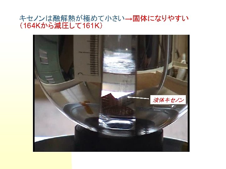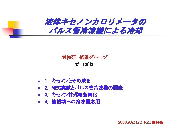 キセノンの物性(沸点、潜熱、密度) Property T(K): temperature P(MPa): pressure lv(J/kg): latent heat (liquid)X 103 ls(J/kg): latent heat (solid) X 103 Cp(J/kg. K): specific heat X 103 (kg/m 3): density (W/m. K): thermal conductivity Triple point LXe (saturated) ● 164. 78 0. 100 95. 8 ● 1. 2 0. 3484 2947 ● 0. 108 161. 36 K 0. 0815 MPa ・融解熱が極めて小さい→固体になりやすい →固体では検出器にならず、PMT破損の恐れ GXe (saturated) LN 2 (saturated) 164. 78 0. 100 --0. 1734 9. 883 0. 0034 (173 K) 77. 35 0. 1013 199. 1 28. 4 2. 03 804 0. 1398 63. 148 K 0. 0125 MPa