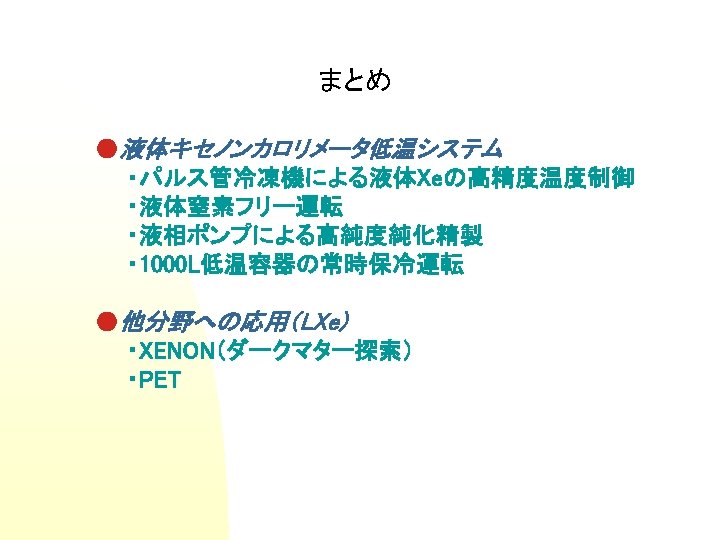 42 -day operation scheme of large prototype calorimeter by cryocooler -2004. 9. 18~21 Pre-cooling (72 hrs) -2004. 9. 21~24 Liquefaction (79 hrs, 1. 5 L/hr) -2004. 9. 24~ Circulation (1. 5 L/hr rate) -2004. 10. 30 Xenon recovery