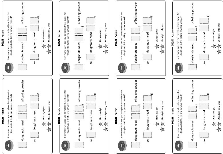 DIGIT Puzzle How many ways can you complete these boxes for doughnuts & the baking powder needed? doughnuts need so g of baking powder 3 doughnuts need so doughnuts need 4 15 2 0 g 63 8 1 g 24 5 6 g g of baking powder doughnuts need g Use any digits 7 Use digits only once 2 doughnuts need so 4 38 7 6 doughnuts need g so of baking powder g Some Answers doughnuts need 3 9 doughnuts need so 7 g of baking powder doughnuts need g of baking powder