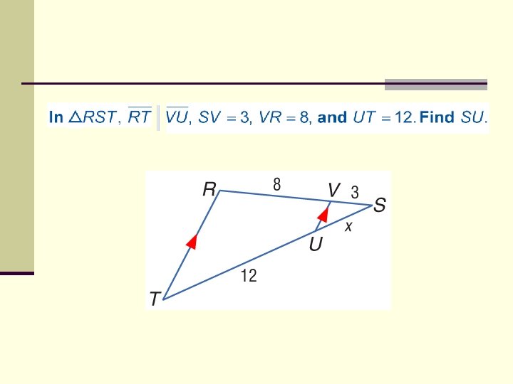 7. 3: Similar Triangles n Triangles are similar if you show: n All 3 pairs of corresponding sides are proportional (SSS Similarity) R B 6 10 5 C A 7 T 14 3 S