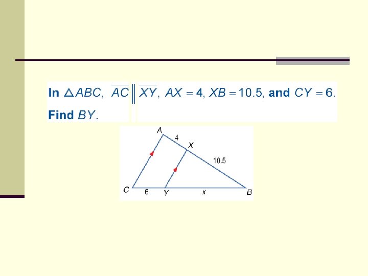 7. 4 : Parallel Lines and Proportional Parts n If a line is parallel to one side of a triangle and intersects the other two sides of the triangle, then it separates those sides into proportional parts. A Y *If XY ll CB, then C X B