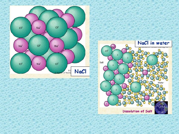 • 4 -Alto poder de solução: • Devido à polaridade da água, os íons e muitas moléculas podem se dissolver nela. • Através da reação de hidratação a água é capaz de quebrar ligações iônicas (ligações fortes). Ex. : 350 g do sal Na. Cl dissolve-se completamente em 1 litro de água = salinidade de 35‰.