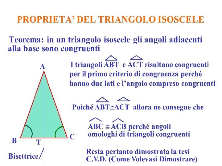 3) gli angoli alla base di un triangolo isoscele sono acuti Infatti α+β<δ=180°-α α+β<180°-α cioè 2α<180°-β α<90°-β/2 Cioè gli angoli alla base sono minori di 90° β α α δ