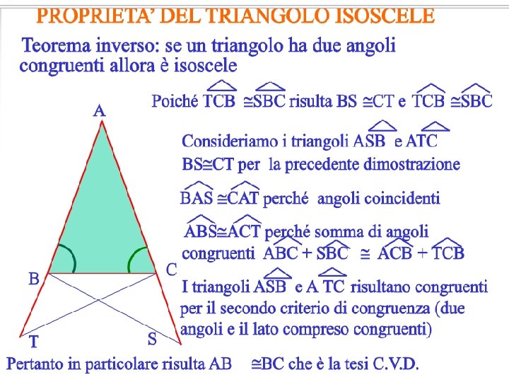 Dimostrazione α α γ Se il lato AC è maggiore di AB, prendiamo su di esso un punto D in modo tale AD=AB. Il triangolo ABD è dunque isoscele ed ha gli angoli ABD= ADB. L’angolo α è angolo esterno al triangolo BDC e pertanto maggiore di γ. Ma α è parte dell’angolo in B quindi a maggior ragione è maggiore di γ.
