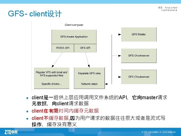 GFS-体系结构 l 文件被切割成固定大小的块(Chunk) l 一个主Master,多个Shadow Master l 多个Chunkserver l 多client 秘密 Proprietary Confidential▲