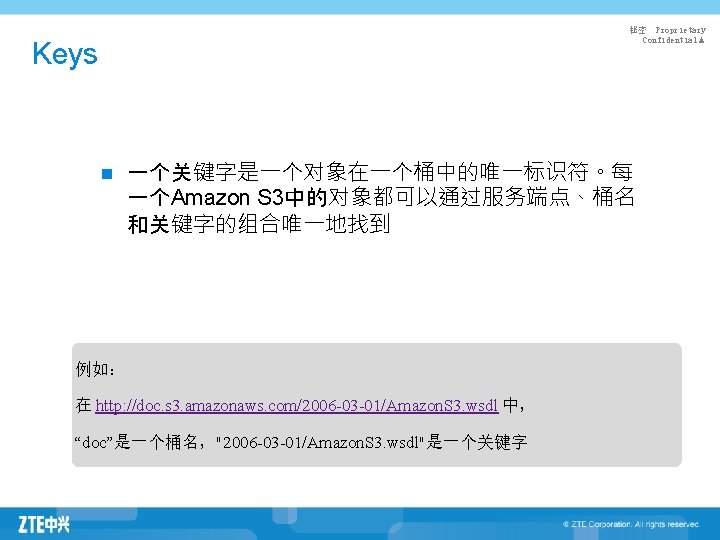 S 3接口:RESTful API n n 秘密 Proprietary Confidential▲ HTTP协议不仅仅可以用来进行网络传输,而且可以用以下几 种API来实现所有的Web操作 l PUT = "here's some new info" (Create) l GET = "give me some info" (Retrieve) l POST = "here's some update info" (Update) l DELETE = "delete some info" (Delete) HTTP API符合CRUD (Create, Retrieve, Update, and Delete) 原则