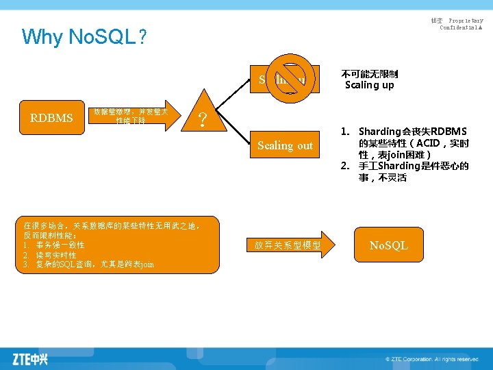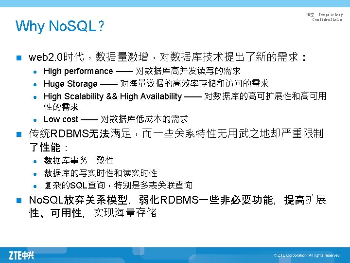What is No. SQL? No. SQL=Non relational或者Not only SQL n No. SQL是相对于RDBMS的,具有以下特征 n l l l l l n 非关系 分布式 开源 水平扩展 schema-free easy replication support simple API 最终一致性 支持海量数据(Huge Data) 不支持ACID No. SQL于2009年发展迅速(http: //nosql-database. org) 秘密 Proprietary Confidential▲