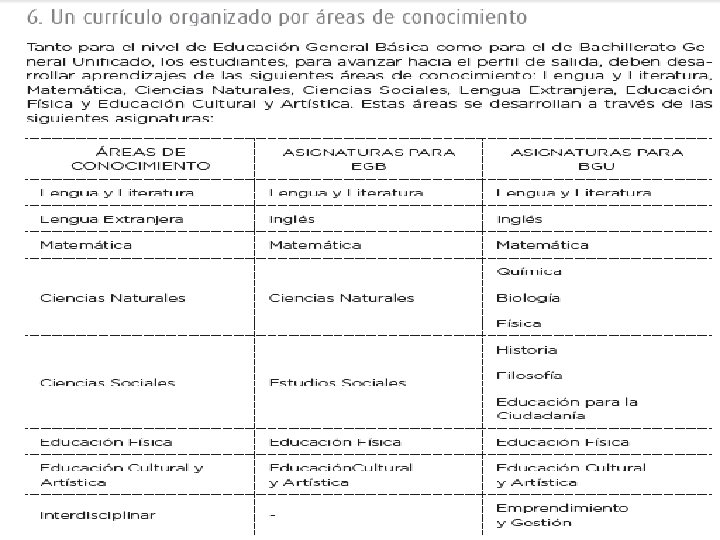 ELEMENTOS DEL CURRICULO 2016 1. Perfil de salida BGU 2. Objetivos integradores de los subniveles, que constituyen una secuencia hacia el logro del perfil de salida 3. Objetivos generales de cada una de las áreas; 4. Objetivos específicos de las áreas y asignaturas para cada subnivel; 5. Bloques curriculares 6. Contenidos, expresados en las destrezas con criterios de desempeño; 7. Orientaciones metodológicas y, 8. Criterios e indicadores de evaluación.